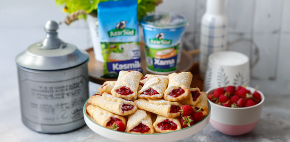 Xəmir üçün yumurta və şəkər tozu qarışdırılır. Duz, xama əlavə edilib qarışdırılır. Kəsmik, yumşalmış kərə yağı qarışdırılır. Un ələkdən keçirilir, qabartma tozu əlavə edilib xəmir yoğrulur. Xəmir soyuducuya qoyulur.İçlik üçün giləmeyvələr, şəkər tozu, nişasta qarışdırılır. Ocaqda 15-20 dəqiqə qarışdırılaraq bişirilir. Tam soyumağa qoyulur. Xəmir nazik yayılır. Dairələr kəsilir. Ortasına içlik qoyulub qıraqları qatlanır.Soba 180 dərəcə qızdırılır. Qurabiyələr soba üçün qaba qoyulub 25 dəqiqə bişirilir.